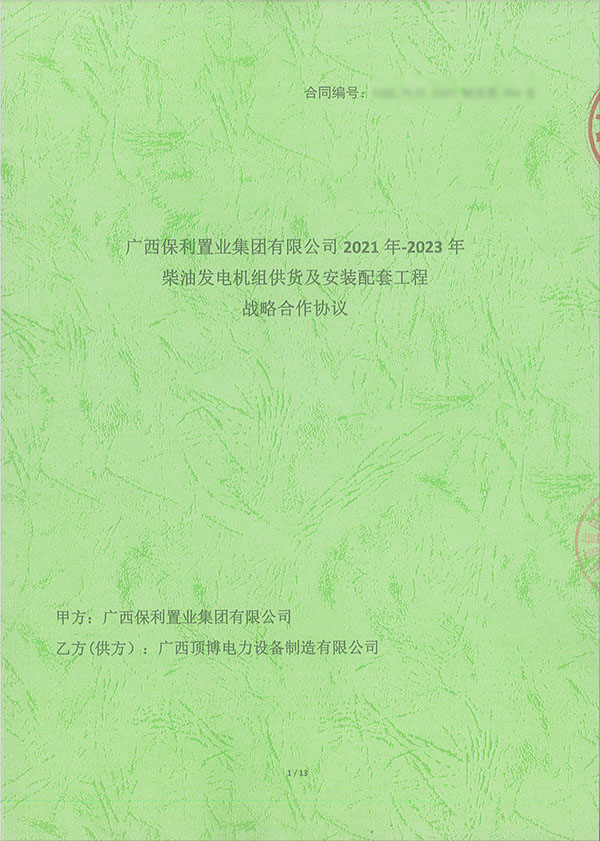 2021年7月26日,廣西頂博電力設(shè)備制造有限公司傳來喜訊,我公司成功與保利置業(yè)集團成功簽訂2021年-2023年柴油發(fā)電機組供貨及安裝配套工程戰(zhàn)略合作協(xié)議,標(biāo)志著接下來的兩年時間內(nèi),作為戰(zhàn)略合作單位的保利集團或其控股的各房地產(chǎn)公司或項目公司在建和即將開發(fā)項目的