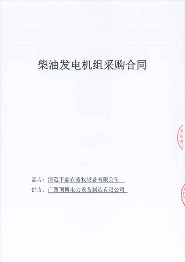 2020年12月31日,在這2020年的最后一天,廣西頂博電力設(shè)備制造有限公司再度傳來好消息,頂博電力與清遠(yuǎn)市鼎農(nóng)畜牧設(shè)備有限公司成功簽訂兩臺柴油發(fā)電機(jī)組,分別是50KW玉柴柴油發(fā)電機(jī)組一臺和100KW玉柴柴油發(fā)電機(jī)組一臺。