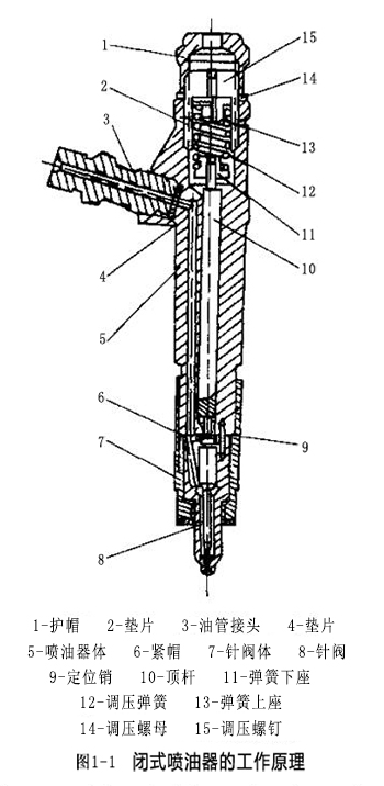 閉式噴油器的工作原理如1-2所示,來自噴油泵的高壓柴油經噴油器體與針閥體內的油道進入油腔,由于噴孔被針閥關閉,腔內柴油壓力便迅速上升。當作用在針閥承壓錐面上的柴油壓力大于調壓彈簧的彈力時,針閥便沿軸向升起,噴孔被打開,于是高壓柴油通過噴孔開始噴入燃燒室。由于噴孔的節流作用,被噴出的柴油形成霧狀的細小顆粒,與空氣迅速開成可燃混合氣。這一噴油過程一直延續到噴油泵停止供油,并在噴油器腔內油壓低于調壓彈簧彈力時,針閥在調壓彈簧作用下立即關閉噴孔,噴油才停止。