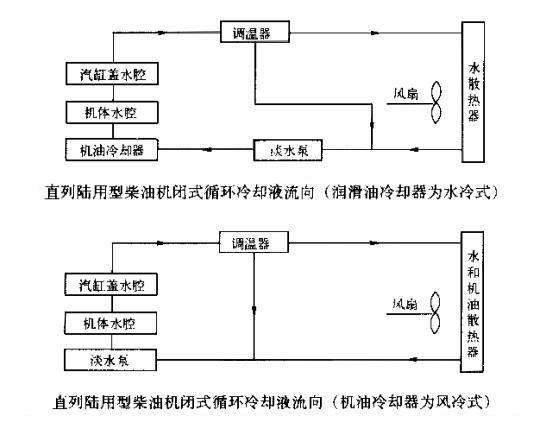 2、閉式循環冷卻系統。所謂閉式循環冷卻系統,就是柴油發電機冷卻系統本身自成完整的封閉循環回路、陸用柴油機的閉式循環冷卻系統即從柴油機出來的高溫冷卻液,通過水散熱器靠風扇強力鼓風來冷卻,冷卻后的水再去冷卻柴油機:閉式循環冷卻系統,按機型和使用機油冷卻器的不同而有所不同,如下圖所示。