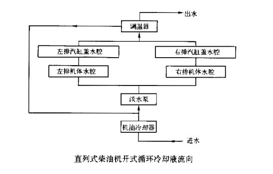 1、開式循環冷卻系統。開式循環冷卻系統即柴油機的進出水口為開式,使用時由用戶自行接通水源。根據柴油機機型和機油冷卻器的布置不同,組成開式循環冷卻系統的形式也稍有區別。其冷卻液流向如下圖所示。